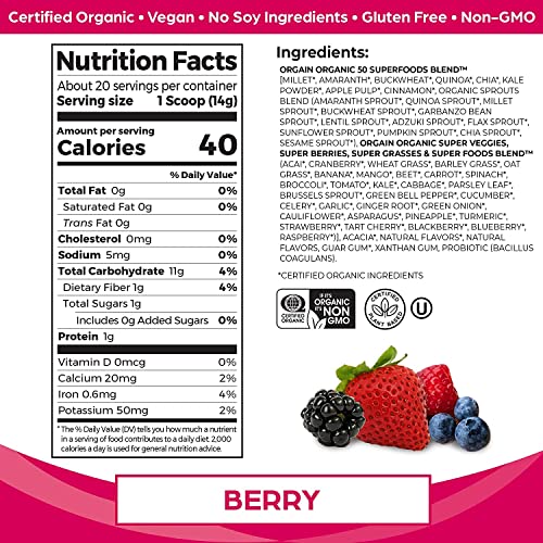 Orgain Organic Green Superfoods Powder, Berry – Antioxidants, 1 Billion Probiotics, Vegan, Dairy Free, Gluten Free, Kosher, Non-GMO, 0.62 Pound (Packaging May Vary)